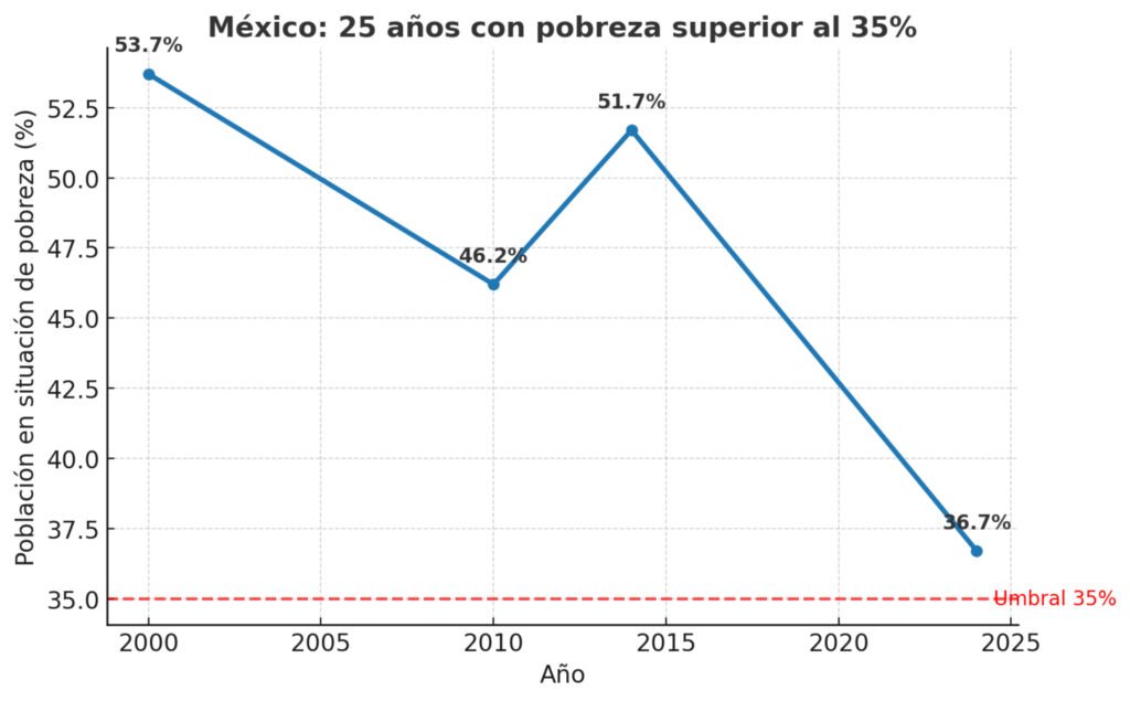 Desde principios de los años noventa, México ha enfrentado un desafío persistente: la pobreza ha mantenido una incidencia superior al 35 % de la población durante más de 25 años, una realidad estructural que ha sido difícil de revertir.